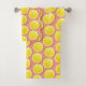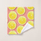 Ein Muster aus frischen und saftigen Zitronenschnitzen in lebhaften, lebhaften Gelbtönen, mit einer Aquarellstruktur, die ihm ein frisch geschnittenes Aussehen verleiht. Sie sind auf einem lachsfarbenen Hintergrund platziert, um einen hellen und sommerlichen Look zu erhalten, wie eine rosa Limonade.