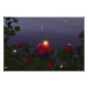 In der Dämmerung einer Sommernacht schweben Glühwürmchen und glühen über einen Rose-Garten voller lebendiger rote Rosen.
