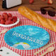 "sommerlicher" Schriftart-Effekt für das Party des Schwimmbades mit dem türkisblauen Becken.