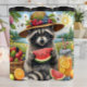 Diese fröhliche Abbildung zeigt einen Kokon mit einem Strohhut, der mit Beeren und Blätter geschmückt ist und einen saftigen Wassermelone-Streifen enthält. Die Szene ist ein sonniges Sommerpicknick mit einem Korb mit verschiedenen Früchten, einem Glas Limonade mit Stroh, lebhaften Bienen und einer hellen, idyllischen Landschaft mit einem Fluss und Blume im Hintergrund.