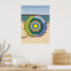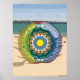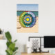 Dieses Strandmandala ist mit Muscheln, Segelbooten, Sand, Sonne, Meer und Palmen in einem transparenten Beachball, der auf einem Sandstrand mit Blick auf das Meer und den Himmel am Horizont sitzt, um den Spaß, der mit dem Sommer kommt, in Erinnerung zu rufen.
