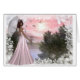 Diese hübsche Dame, die an einem Sommerabend am See mit rosa Himmel spaziert und von transparenten Schmetterlingen umgeben ist...