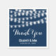 Moderne Summer Wedding String Lights Design Hochzeitsempfang dank Servietten mit schlichten, eleganten, weißen Lichtern, die über die Decke hängen, mit einem stilvollen Mix aus moderner Typografie auf einem dunkelblauen sommerlichen Hintergrund. Ein schlichtes und trendiges Design, perfekt für den Sommer! Klicken Sie auf den "IT KENNEN"-Button, um die Schriftart anzupassen, den Text zu verschieben, die Hintergrundfarbe zu ändern und Ihr eigenes einzigartiges One-of-the-Art-Floating-Party-Design zu erstellen.
