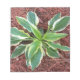 Eine abwechslungsreiche Sun Hosta Pflanze in einem Doppelbett mit Blume