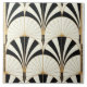 Art Déco gestreiftes Muster mit schwarz-weißen Halbkreisen, die eine Fächerform nachahmen und goldene Ränder mit Sonnenstrahlen und von einem goldenen Zierrahmen flankiert werden.