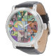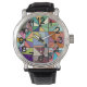 Die Armbanduhr dieses Mannes hat ein abstraktes Design, das aus neun Quadraten besteht, mit einem Kreis und "Strahlen", die in vielen verschiedenen Farben aus dem Kreis kommen.