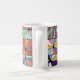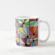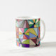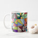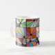 Diese Tasse hat ein abstraktes Design, das aus neun Quadraten mit einem Kreis und "Strahlen", die aus dem Kreis in vielen verschiedenen Farben kommen, besteht.