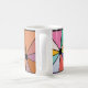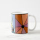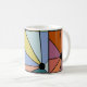 Diese Tasse hat ein abstraktes Design, das aus neun Quadraten mit einem Kreis und "Strahlen", die aus dem Kreis in vielen verschiedenen Farben kommen, besteht.