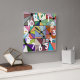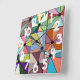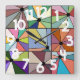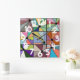 Diese Wanduhr hat ein abstraktes Design, das aus neun Quadraten besteht, mit einem Kreis und "Strahlen", die in vielen verschiedenen Farben aus dem Kreis kommen.