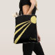 Elegante Tasche mit Sonnenstrahlen auf schwarzem Hintergrund. Drei Strahlen, die aus der Sonne hervorgehen, sind drei Aspekte des Lebens: Körper, Geist und Geist. Der sonnige Text kann personalisiert sein.