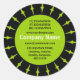 Eine Aufklebervorlage mit einer attraktiven schwarz-weißen Sonnenstrahlen-Umgebung. Diese Version ist mit Feldern für einen Firmennamen und Kontaktdaten ausgestattet. Obwohl der Text auf dem 1,5"-Aufkleber ziemlich klein sein wird, sollte er gut lesbar sein.