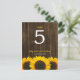 Numéro de table mariage à thème champêtre avec des tournesols jaunes sur un arrière - plan rustique en bois de grange brun foncé. Modifiez le numéro de chaque table dont vous avez besoin et ajoutez-en un à la fois à votre panier.