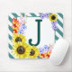 Ein niedliches monogramm Mauspad mit Sonnenblumen und diagonalen aquamarinen Streifen.