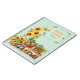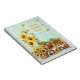 Spiral bound garden journal with sunflowers and vegetables design. Customize with a title (ex. is "Garden Growing Notes") in printed gold lettering over a sage green background. Happy sunflowers grow up the side of the cover, with more flowers in a basket, and still more that decorate the text area. Two shelves of buckets, baskets, and fresh produce decorate the bottom. Journal size is 6.5 x 8.75 inches with 80 lined pages inside.