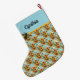 This lovely and unusual holiday stocking features a wallpaper-like background of sunflowers, honeycomb, and bees. The top of the stocking has a complementary blue (kind of a vintage turquoise or dusty aqua) with a gold border and the recipient's name in black with a bee flying across the border.