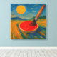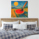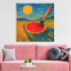 Dieses lebendige surreale digitale Bild zeigt einen riesigen Pinsel, der auf einer halbierten roten Wassermelone platziert wurde und Natur und Kreativität in einer spielerischen, traumhaften Komposition vereint. Eine große, gelbe Sonne strahlt in einem strukturierten, blauen Himmel und strahlt Wärme über eine weitläufige, minimalistische Landschaft, die in fließenden Grüntönen, Blues und Gelben gemalt ist. Die Szene verbindet Launen mit symbolischer Tiefe - was auf eine Welt hindeutet, in der Schöpfung und Realität untrennbar miteinander verwoben sind.