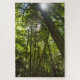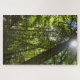 Sunlight filters through a dense forest canopy, illuminating layers of branches and leaves from below. The upward perspective captures the height and depth of the trees, creating a natural sense of immersion in the woods.
