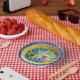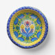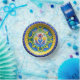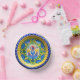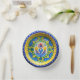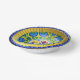 Eine Einwegpapiertafel mit einem fröhlichen, gelben Hintergrund aus Sonnenblumen und einem blauen Fliesenmuster rund um den Rand. Das Design erinnert an den sonnigen Charme und die faszinierenden Motive der spanischen Architektur, die sich perfekt für ein Party im Sommer oder für eine Veranstaltung mit mediterranen Themen eignen.