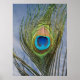 Das nahe Foto eines Pfauenfederplakats. Die Sonne, die von der Feder reflektiert wird, lässt sie glänzen.