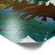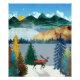 Eine wunderschöne Landschaft mit einzigartigen Farben und Texturen, die eine Berg- und Seenlandschaft und einen mehrfarbigen Wald mit aufsteigender Sonne und einem Elch in den Farben Blau, Grün, Gold und Magenta zeigen.