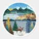 Eine wunderschöne Landschaft mit einzigartigen Farben und Texturen, die eine Berg- und Seenlandschaft und einen mehrfarbigen Wald mit aufsteigender Sonne und einem Elch in den Farben Blau, Grün, Gold und Magenta zeigen.