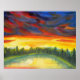 Acrylic on canvas of a colorful sunrise over a still lake at the edge of a forest.