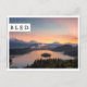 Carte postale d'un lever de soleil coloré sur le lac Léman avec l'île en début de matinée en Slovénie avec un bord blanc et le texte : 'Bled'.