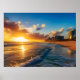 Ein atemberaubender Sonnenuntergang malt den Himmel in lebhaften Farbtönen in Orange, Rosa und Blau und strahlt ein warmes Licht über einen unberührten Strand aus. Die teilweise von Wolken verschleierte Sonne reflektiert die sanften Wellen, die sich am Ufer ereignen. Eine Reihe großer Gebäude steht zum Horizont schweigend und fügt der idyllischen Szene eine Touch urbanen Lebens hinzu.
