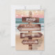 Carte d'intervention romantique des mariages océaniques avec un coucher de soleil luxuriant, plage de sable, des lumières à corde et votre texte rsvp écrit sur un panneau en bois rustique.