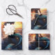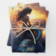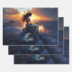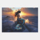 Eine schöne Meerjungfrau sitzt auf einem felsigen Ufer, ihr schimmernder Schwanz strahlt im goldenen Sonnenuntergang.