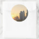 Rundaufkleber mit Wolkenkratzern in der Wolkenkratzer-Silhouette des kommerziellen Zentrums von Doha, die Hauptstadt des arabischen Golflandes Katar bei Sonnenuntergang.