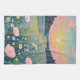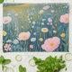 Dieses Kunstwerk vereint eine ruhige und mystische Landschaft bei Sonnenuntergang mit einer traumhaften Qualität, die detaillierte natürliche Formen mit einer spirituellen, ätherischen Atmosphäre verbindet. Im Vordergrund steht eine lebendige Wiese mit sanften, pastellfarbenen Mohn und Wildblumen, die jeweils mit einer zarten, stilisierten Touch gerendert werden. Ein kurvenreicher Weg oder Bach führt das Auge in die Ferne, wo ein dunkler, ruhiger Wald den Horizont unter einem weiten Himmel umschlingt, der in einem leuchtenden Farbverlauf von rosa, pfirsichfarben und aquamarin gemalt ist. Am Himmel hängt eine blasse, volle Sonne oder Mond, die ein sanftes Licht über die gesamte Szene wirft. Das Stück erinnert an ein Gefühl der Ruhe, des Zaubers und der ruhigen Schönheit der Zyklen der Natur.