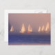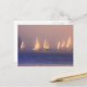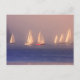 Foto von sieben Segelbooten, die bei Sonnenuntergang im Nebel segeln. Lila Töne und das blaue Wasser des Ozeans an einem scheußlichen Tag machen dieses wunderschöne Bild des Pazifischen Ozeans deutlich. Sie können dieses Segelboot-Bild mit Ihrem eigenen Text anpassen und auf vielen verschiedenen Produkten drucken lassen.