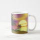Kaffee-Tasse mit meinem Kunstwerk einer sonnigen und entspannenden tropischen Szene einer Insel, Palmen und Segelboot fahren an einem großen Sonnenuntergang vorbei.