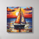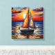 Ein einsames Boot treibt friedlich auf dem Wasser und badet im warmen Glühen eines atemberaubenden Sonnenuntergangs. Der Himmel ist in Orange-, Rosa- und lila Farbtönen gestrichen und reflektiert wunderschön auf den Wellenbrechern. Dieses Kunstwerk erinnert an ein Gefühl der Ruhe und Abenteuer, ideal für diejenigen, die das Meer und die Magie der Dämmerung Liebe.