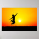 Ein Mädchen, das auf einem Hügel vor einem blutroten Sonnenuntergang in die Luft springt