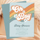 Oh Baby Retro Baby shower Invitation avec un arrière - plan bleu boho, fleurs de marguerite éparpillées, arc-en-ciel, et les mots "oh garçon" dans une police super des années 70. Retournez notre douce invitation pour voir un dos bleu coordonné.