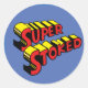 Design zeigt die Worte "Super Stoked" in rot und gelb 3D-Schrift vor blauem Hintergrund