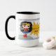 Hälfte dieser Supermädchen-Cartoon-Tasse ist in der Farbe und die andere Hälfte ist Schwarz-weiß, beides Seite haben Spracheblasen, die Sie Ihren Text herein setzen können. Ein bisschen wie, vor dem Kaffee (Schwarzweiss) und nach Kaffee. :) (die bunte Seite!)