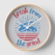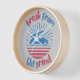 Eine Uhr mit einem Auto mit Surfbrett oben, wobei der Satz "Break from the Grind" um das Bild zentriert ist. Das Design legt einen sorglosen und abenteuerlichen Ausweg aus dem Alltag nahe.
