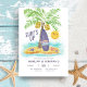L'invitation à la fête d'anniversaire à thème de la plage et du surf comporte une légende "surf up" et une île tropicale aquarelle avec surf, palmier, soleil kawaii et étoiles de mer. La couleur dominante est le violet muet, il est donc parfait pour un garçon ou une fille. Art par KL Stock