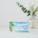 Diese Visitenkarte verfügt über ein Surfbrett an einem tropischen Strand mit Palmen. Das Wasser ist schön blau, und es gibt Wolken, die am Himmel verstreut sind. -