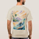 Dieser T - Shirt ist mit einem Aquarellbild versehen, das einen Surfer beim Sonnenuntergang mit einer türkisfarbenen Welle darstellt. Der Surfer trägt einen blauen Neoprenanzug und balanciert auf einem gelb-orangefarbenen Surfbrett, während er sich durch die Curling-Welle bewegt. Die Welle hat weißen Schaum und Spray mit grünen Untertönen. Im Hintergrund liegen große Palmen mit grünen Fronten an der Küste. Lavendel getönte Berge sind in der Ferne auf einem dramatischen Sonnenuntergang Himmel. Der Himmel weist wirbelnde Muster aus orangen, gelben und lavendelfarbenen Pinselstrichen auf, die einen Sonnenuntergang erzeugen. Das Wasser überwindet sich von türkis im Vordergrund zu Gold in der Nähe der Küste. Der T - Shirt ist ein T - Shirt für Männer. Der T - Shirt ist sandfarben.