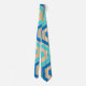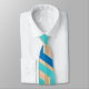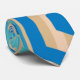 Diese Krawatte hat ein geometrisches Design von Sechsecken in vier Blautönen auf einem Feld von bräunlichen Streifen in zwei Tönen.