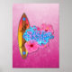 Surfer Girl Design mit Wasserspritzen, Retro-Stil Surfbrett mit hawaiianischen Honu Schildkröten, und rosa Hibiskus Blume.