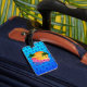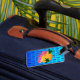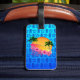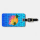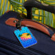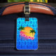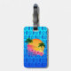 Surfermädchen mit Brandungsbrett, Palmen, Sonnenuntergang und Hibiskus-Blumen. Mit einem Ozeanblauhintergrund und hawaiischen Honu Meeresschildkröten und Tiki Masken.
