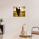 Ein individualisierbares Poster eines Surfers stehend am Strand mit seinem Surfbrett in seinem und bei Sonnenaufgang mit dem Zitat "Das Leben geht darum, die richtige Welle zu fangen und es so lange wie möglich zu reiten", geschrieben unten.