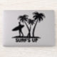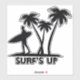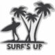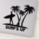 Das Surfen inspirierte einen großen vergossenen Aufkleber einer schwarzen Silhouette eines Surfers, der ein Surfbrett und Palmen trägt. Der schwarze grafische Text liest Surf's Up.