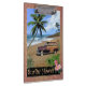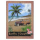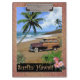 Schönes Retro-Design, mit einem Oldtimer-Auto mit Surfbrett am Strand.