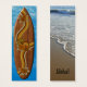 Inspiriert durch die Boardshorts und Aloha-Shirts der 60er Jahre, kombiniert dieses kühn gefärbte Muster Wettkampfstreifen, Hibiskus und eine Palmeninsel. Das Muster fällt in das natürliche Holz des Surfbrettes. Passen Sie das Lesezeichen mit Ihrem eigenen Sprichwort an oder nutzen Sie unser. Die Rückseite ist ein originelles Foto von einem schönen tropischen Strand.
